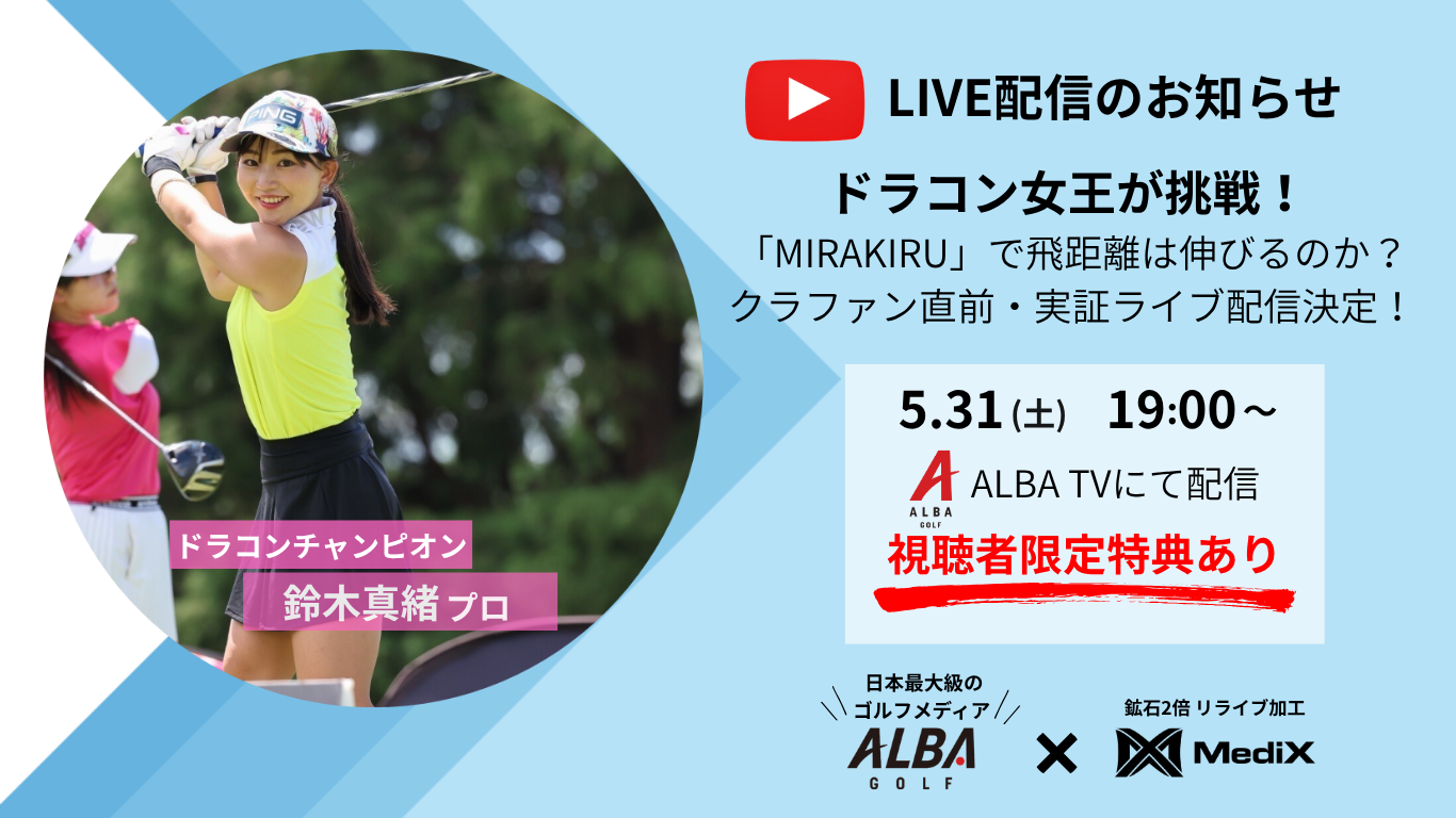 本配信では、女子ドラコン界の第一人者であり、数々の大会で優勝経験を持つドラコン女王・鈴木真緒プロをゲストに迎え、「MIRAKIRU」を着用した状態での飛距離やスイングの変化をリアルタイムで検証。プロの視点からその性能を深掘りします。