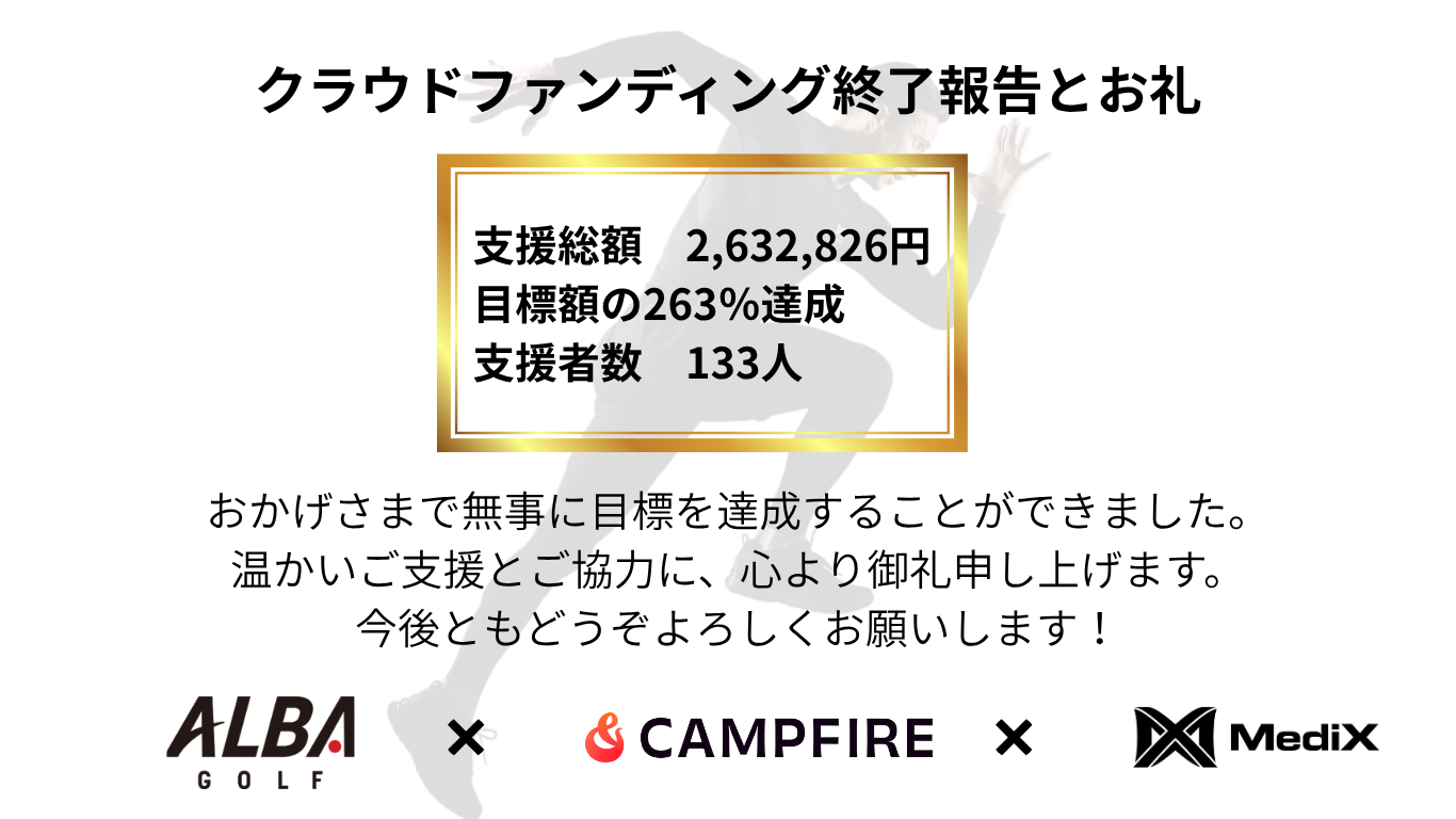 日本最大級のゴルフメディア「ALBA」様との共同企画により実施したクラウドファンディングプロジェクトが、6月29日に終了し、目標金額を大幅に上回るご支援をいただいたことをご報告いたします。